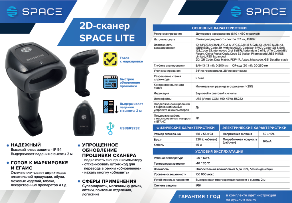Сканер штрих-кода SPACE LITE поддерживает быстрое обновления прошивки через подключение к ПК. Подключение к другим устройствам осуществляется за счет интерфейсов RS-232 и USB. Корпус сканера изготовлен из прочных материалов и имеет высокий класс защиты IP54. Устойчив к падениям на бетонную поверхность с высоты до двух метров. Подойдет для использования на любых торговых точках, в том числе во влажных и холодных помещениях, также сканер SPACE LITE подходит для работы с обязательной Маркировкой товаров (шубы, лекарства, шины, одежда, табачная продукция) и для реализации крепкой алкогольной продукции в системе ЕГАИС.